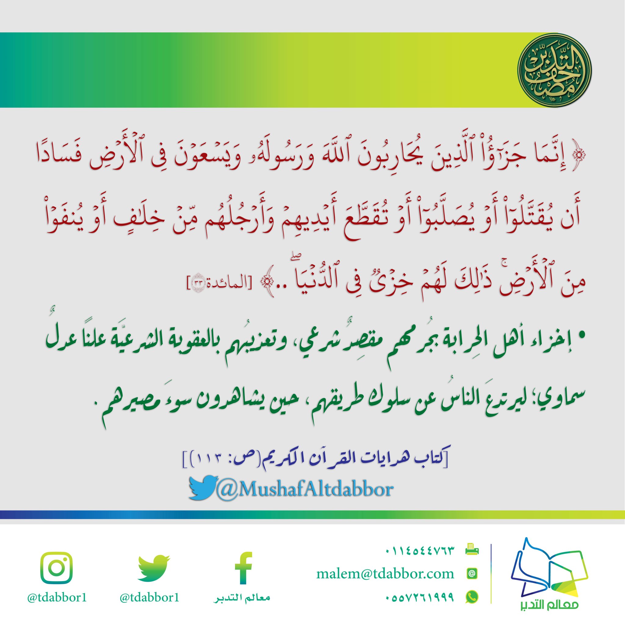مصحف التدبر On Twitter إنما جزاء الذين يحاربون الله ورسوله ويسعون في الأرض فسادا ذلك لهم خزي في الدنيا إخزاء أهل الح رابة بجرمهم مقص د شرعي وتعذيبهم بالعقوبة الشرعية علنا عدل