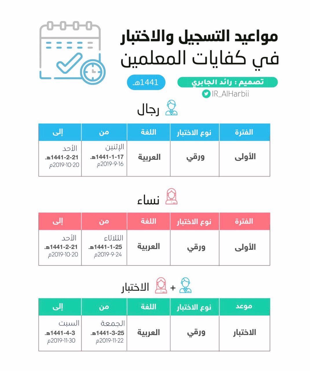 محمد الزارع Twitterren التسجيل في اختبار كفايات المعلمين والمعلمات سيتاح للرجال يوم الاثنين 17 1 1441 إلى يوم الأحد 21 2 1441 وسيتاح للنساء يوم الثلاثاء 25 1 1441 إلى يوم الأحد 21 2 1441 موعد الاختبار