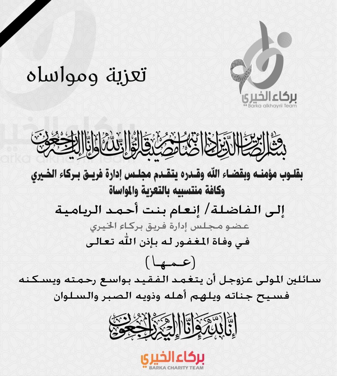 فريق بركاء الخيري On Twitter يتقدم مجلس إدارة فريق بركاء الخيري وكافة منتسبيه بخالص التعازي والمواساة للفاضلة إنعام بنت أحمد الريامية عضو مجلس إدارة الفريق في وفاة المغفور له بإذن الله تعالى